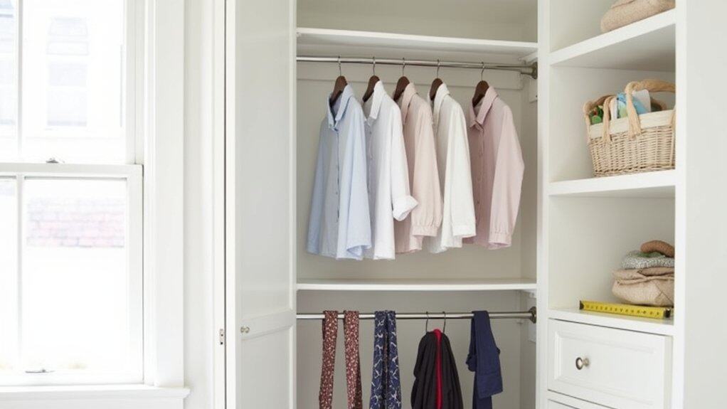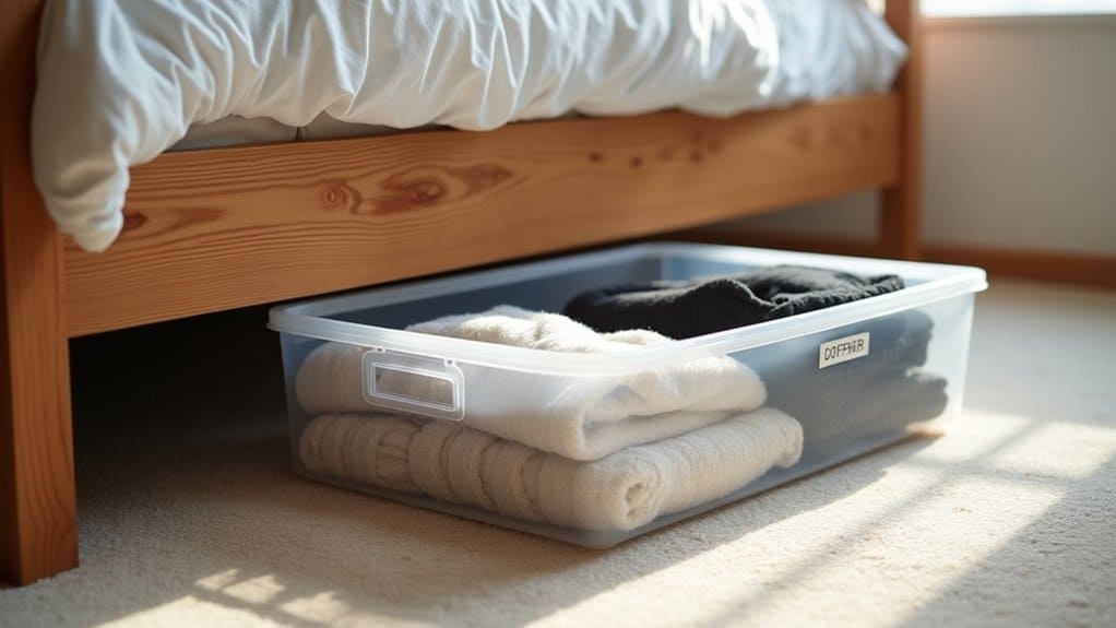 Under-bed storage is a fantastic way to maximize space in a small bedroom while keeping your wardrobe organized. Start by investing in low-profile storage bins or boxes that can easily slide under your bed, guaranteeing they are sturdy and have lids to protect your items from dust. Measure the height and width of the space under your bed to guarantee the containers fit snugly without wasting any room.