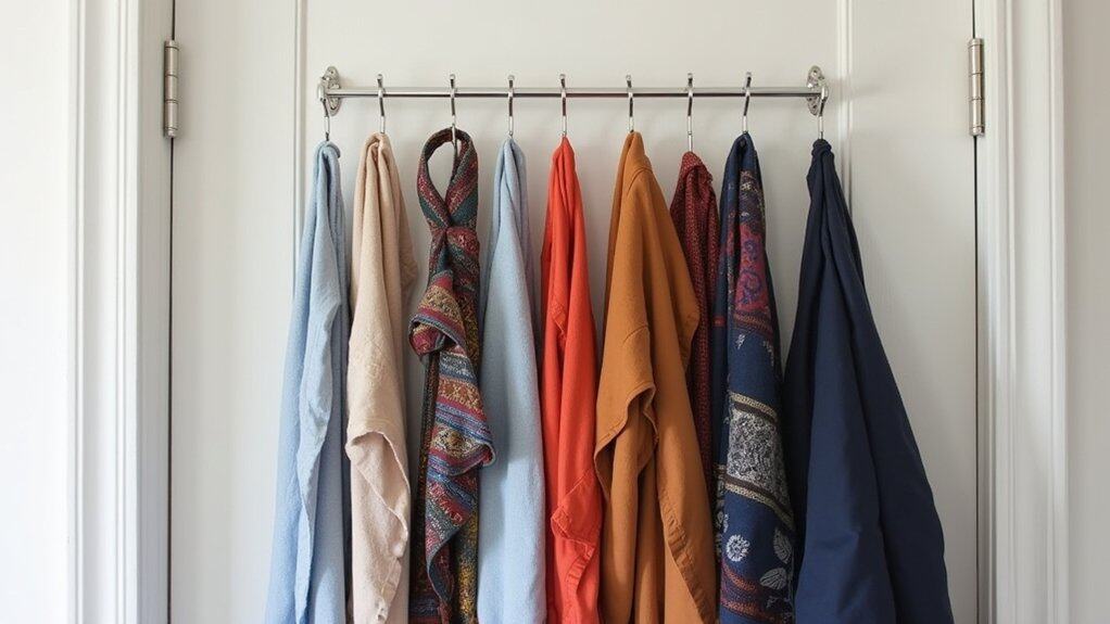 To install, choose over-door hooks that fit the thickness of your door and guarantee they have a padded or rubber backing to prevent scratches. Hang items strategically by grouping similar accessories together, such as keeping all belts on one hook and scarves on another, for quick identification. Make certain not to overload the hooks to avoid damaging the door or causing items to fall off.