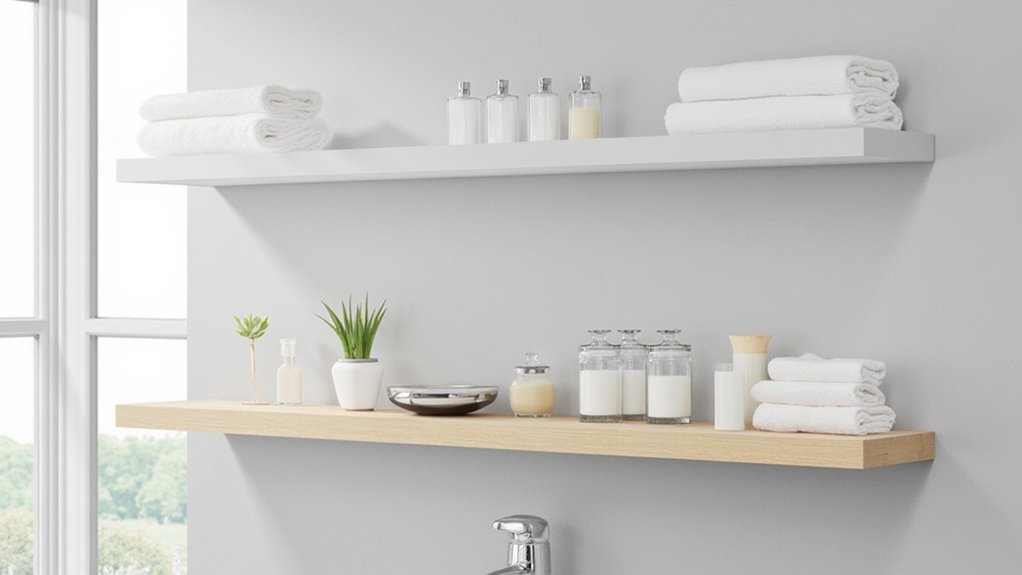 Moving from towel racks to another practical upgrade, consider installing a modern shelf in your guest bathroom for extra storage and style. A shelf adds function and flair, and it’s easy to set up in under an hour. Pick a sleek, wall-mounted option, ideally 24 inches wide, to fit most spaces.
