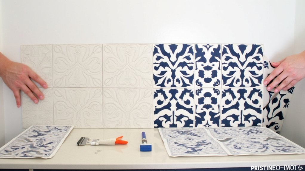 Shifting from cabinet knobs to another simple update, consider using innovative tile stickers to revamp your guest bathroom. These peel-and-stick decals transform outdated tiles without messy grout or costly replacements. You’ll find them in various patterns, fitting standard 4×4-inch or 6×6-inch tiles, and they’re easy to apply in under an hour.