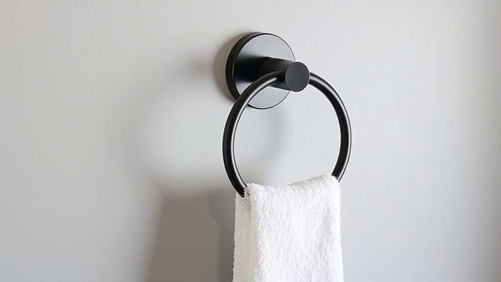 Transform your guest bathroom by swapping out old, worn towel holders for sleek, modern towel rings. You’ll instantly elevate the space with minimal cost and effort, creating a polished look. Grab affordable rings online or at hardware stores, ensuring they’re 5-6 inches in diameter for standard towels.