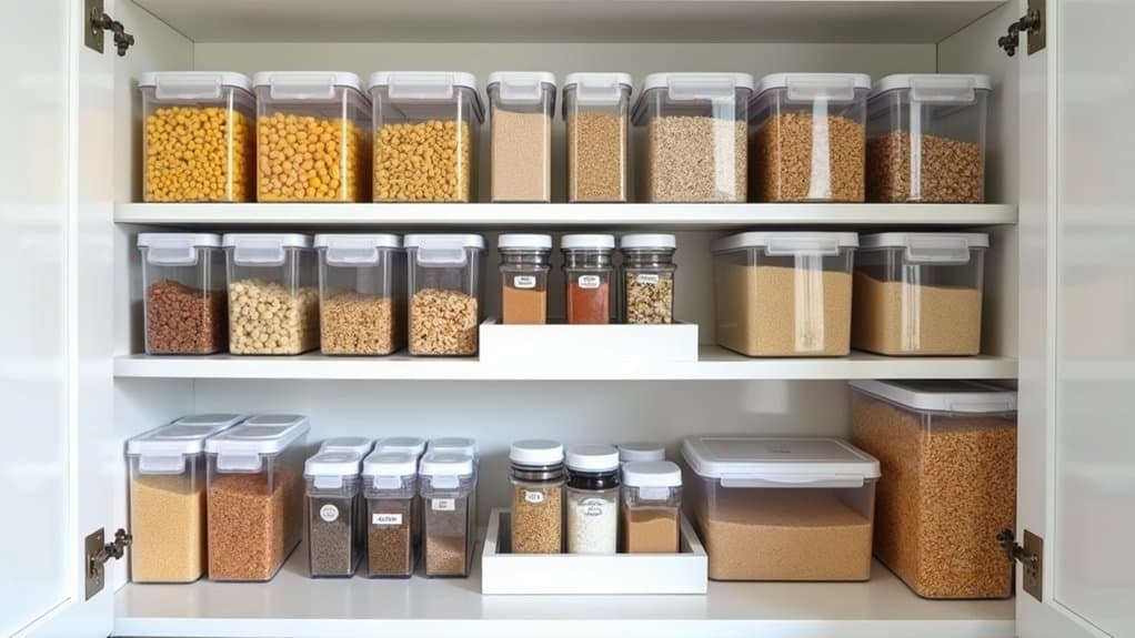 To maximize the effectiveness of clear containers, consider stacking or tiered organizers to utilize vertical space within your cabinets. Arrange containers with frequently used items at eye level for easy access, while less-used items can be placed higher or lower. If aesthetics are a concern, opt for uniform containers with a cohesive design to create a polished, clutter-free look. Finally, regularly review and declutter the contents of these containers to guarantee they remain functional and relevant to your needs.