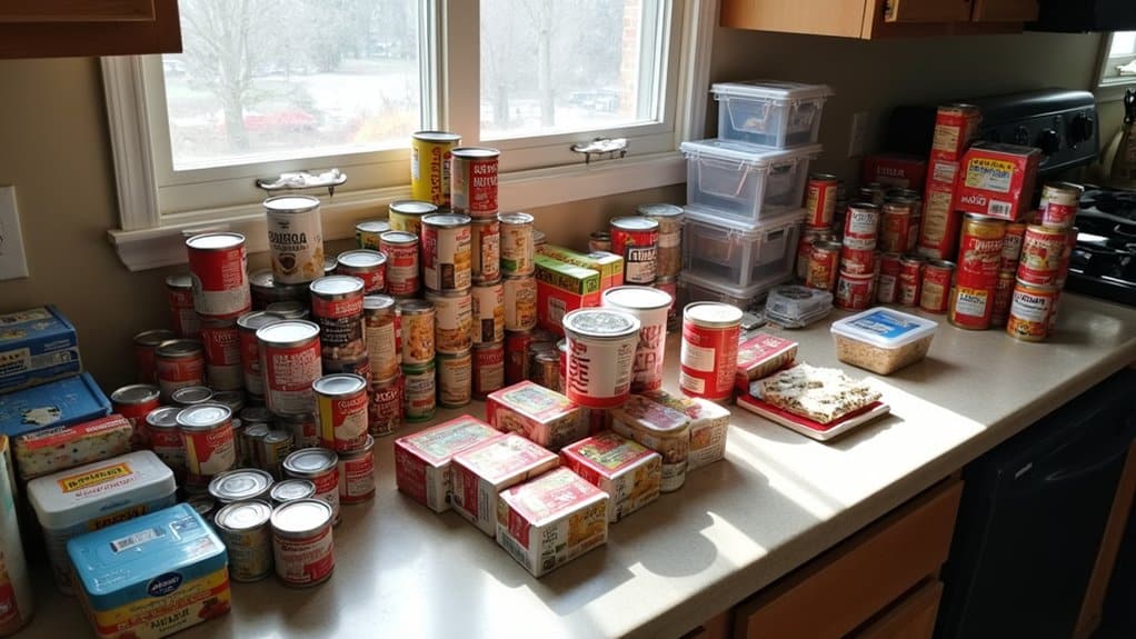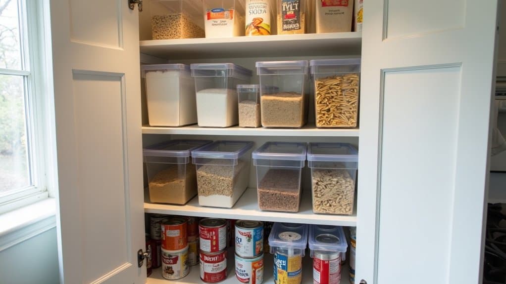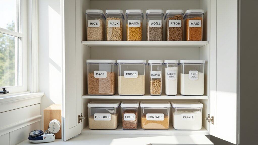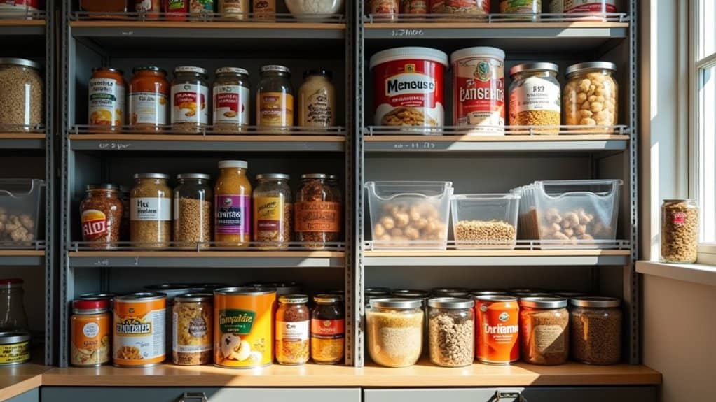 To make rotation effortless, consider grouping similar items together, such as canned goods or spices, so you can easily see and access older stock. Label shelves or containers with categories and dates if needed, especially for bulk items or homemade goods. A quick glance will remind you of what needs to be used soon. This habit not only keeps your pantry organized but also guarantees you’re consuming food at its peak quality.