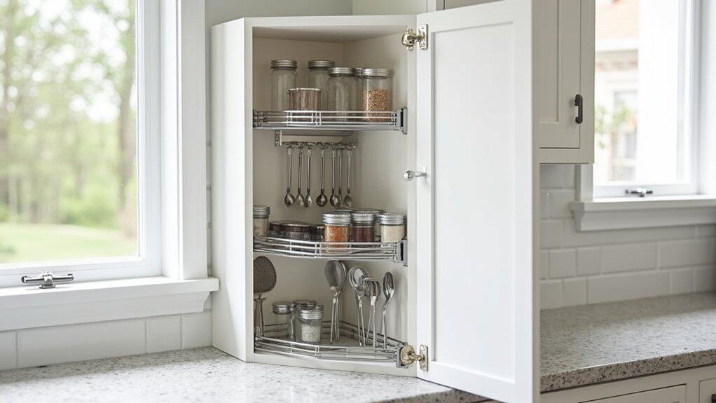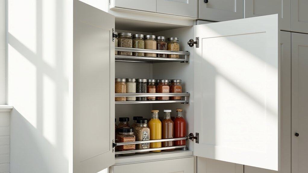 Maximizing cabinet door space with racks is an excellent way to boost storage and keep frequently used items within easy reach. Start by evaluating the inside of your cabinet doors to determine the available space and guarantee that racks or organizers won’t interfere with shelves or contents when the door closes. Install over-the-door racks or adhesive hooks specifically designed for cabinets, which can hold lightweight items like spices, cleaning supplies, or small kitchen tools. Make sure to measure the width and height of the door to choose racks that fit securely without overloading the hinges.