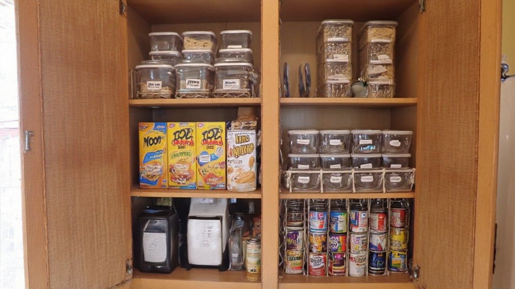 To implement this system, empty your cabinet completely and assess all items before sorting them into logical groups. Decide on categories that make sense for your household, such as separating snacks, canned vegetables, or pasta and grains. Use clear bins, baskets, or shelf dividers to physically separate these groups, making sure everything stays in its designated spot. Label each section if needed, especially for shared spaces, to guarantee everyone in the household can maintain the organization over time.