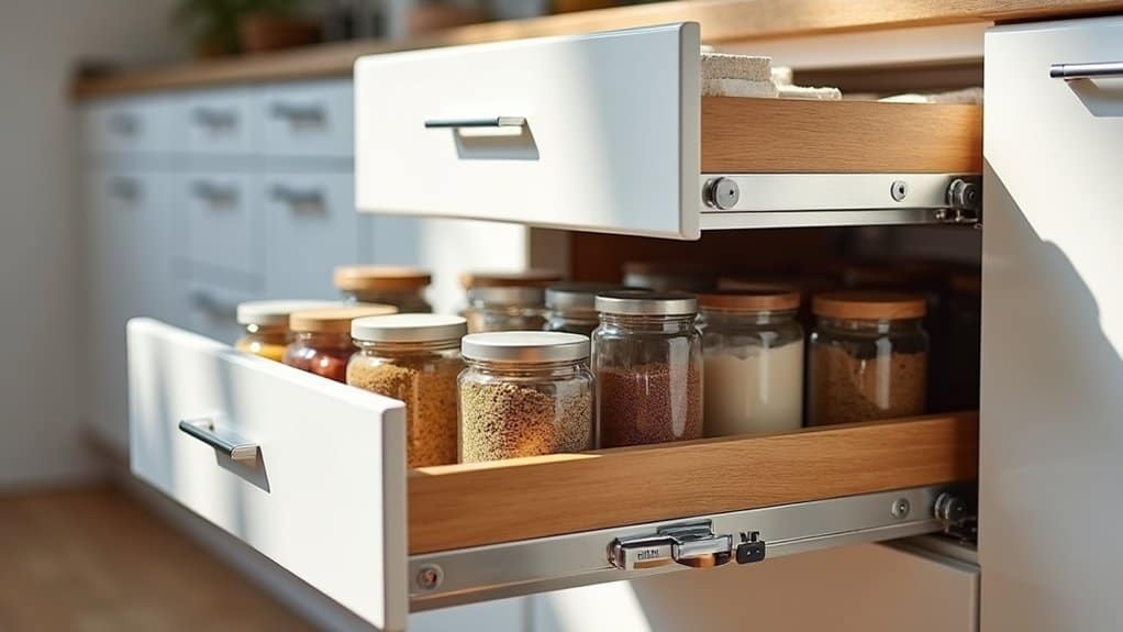 Installing pull-out drawers in your cabinets can transform the way you access and organize your items, making everything more convenient and efficient. Start by measuring the interior dimensions of your cabinet to guarantee the pull-out drawers you purchase or build will fit properly. Choose drawers with full-extension slides to maximize access to the entire drawer space, even in deeper cabinets. Finally, consider soft-close mechanisms to prevent slamming and protect both the drawers and the items inside from damage.