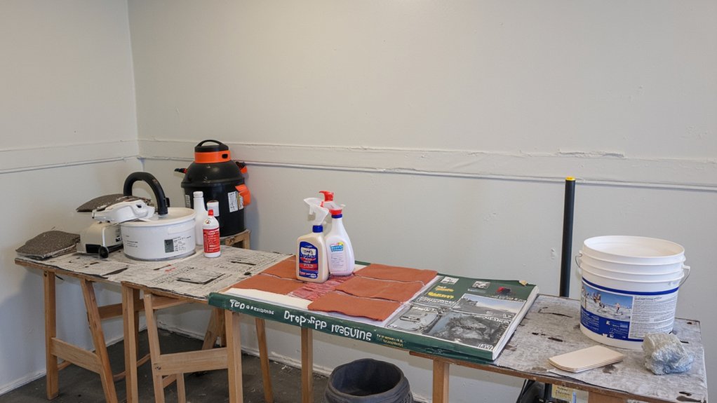 To achieve a professional paint finish on plaster, you’ll need to complete several essential preparation steps that protect your investment and guarantee lasting results.