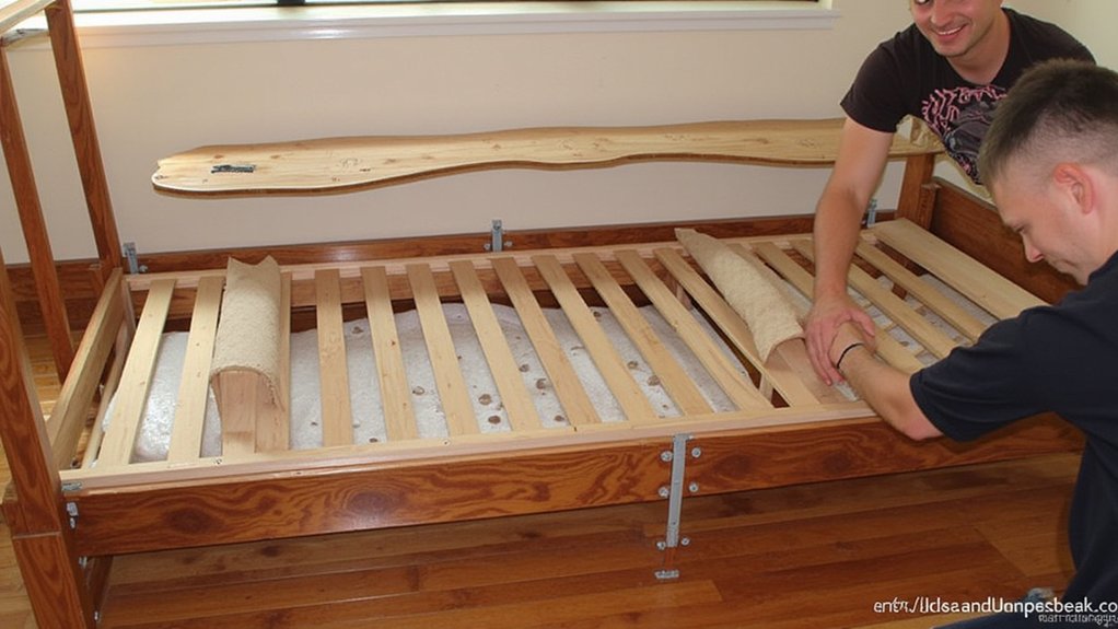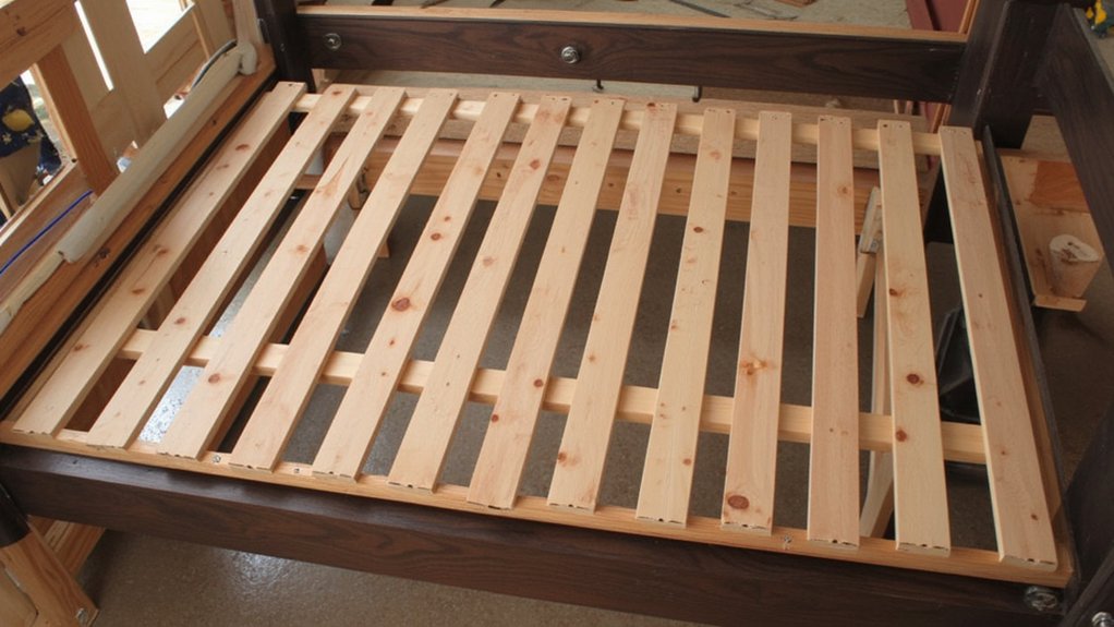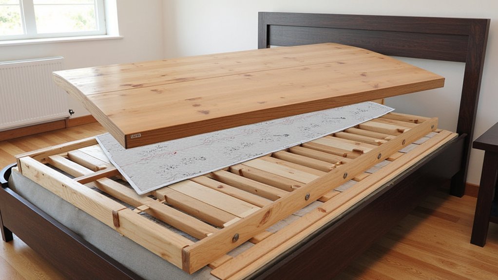 Installing a bunkie board on top of bed slats requires careful attention to proper positioning and secure attachment methods. First, verify your slat spacing doesn’t exceed 3 inches for ideal support of the bunkie board materials.