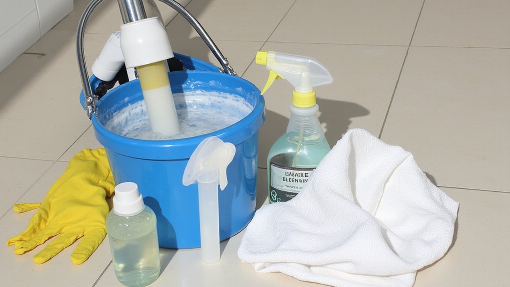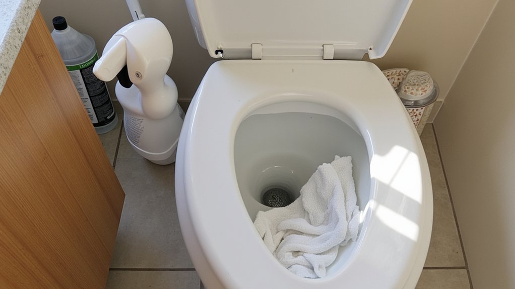 You’ll risk damaging your septic system with harsh bleach cleaners. For better septic safety, use eco-friendly bleach alternatives like vinegar, baking soda, or enzyme-based cleaners when disinfecting bathroom surfaces.