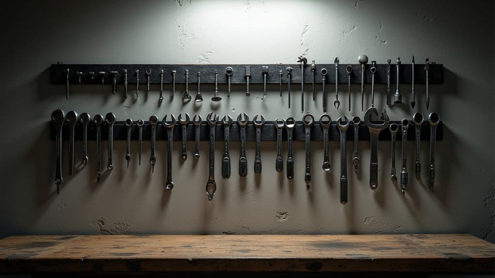 Position the hooks at varying heights to accommodate different tool sizes and guarantee easy access. Group similar tools together, like hanging all screwdrivers in one area, to create an intuitive system that saves time. Regularly check the hooks for stability and rearrange them as needed to maintain an organized and accessible setup.