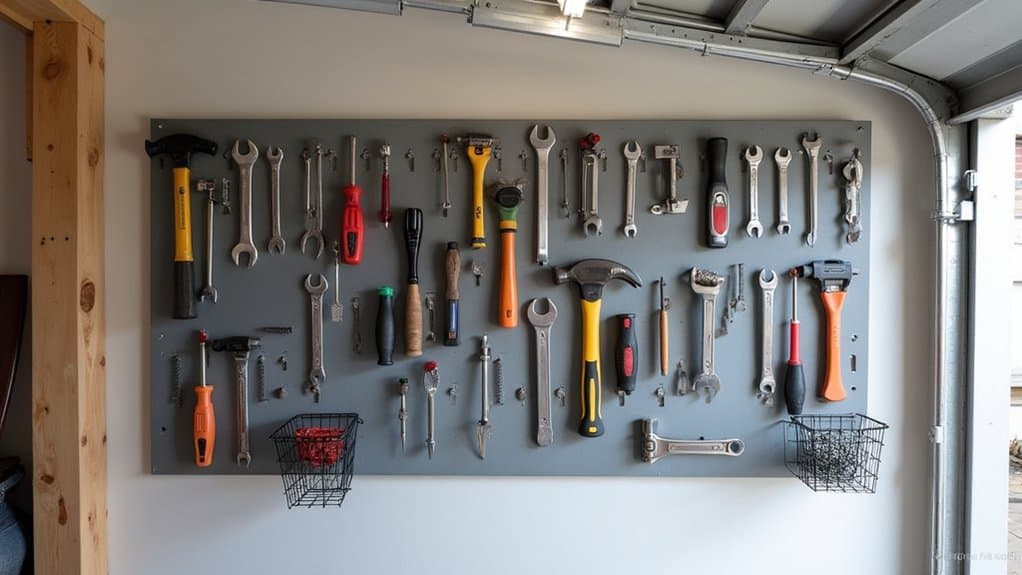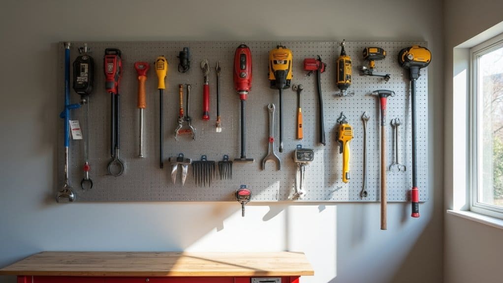 Creating a pegboard organization system is an effective way to keep your garage tools and supplies accessible and tidy. Start by selecting a suitable wall space in your garage and measuring the area to determine the size of the pegboard you’ll need. Install the pegboard securely using a frame or furring strips to guarantee it sits slightly off the wall, allowing hooks to slide in easily.