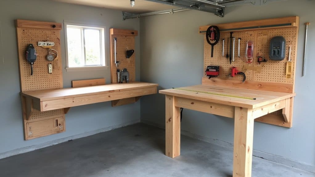 A folding workbench is an excellent solution for maximizing space in a cluttered garage while maintaining functionality. Start by selecting a wall-mounted folding workbench that suits your needs, guaranteeing it’s sturdy enough to handle your projects when extended. Install it at a comfortable height on a garage wall with ample clearance for tools and materials, using heavy-duty brackets or hardware for secure mounting.