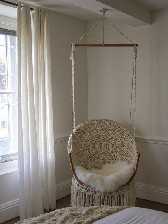 A cotton rope swing chair combines playful comfort with elegant design, serving as a striking accent piece that works in various bedroom styles. From bohemian to coastal Hampton aesthetics, this indoor version of the classic outdoor swing creates an inviting reading nook while adding visual interest to any corner.