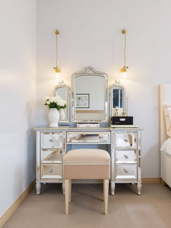 Mirrored vanity console tables serve as elegant bedroom centerpieces that combine function with sophisticated style. These versatile pieces feature reflective surfaces that brighten spaces while providing essential storage and preparation areas for daily grooming routines.