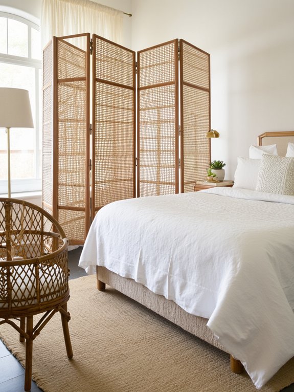 Woven bamboo room dividers create natural partitions while adding sustainable, organic elements to bedroom spaces. These versatile screens combine functionality with aesthetic appeal, featuring intricate weave patterns that allow light and air circulation while maintaining privacy.