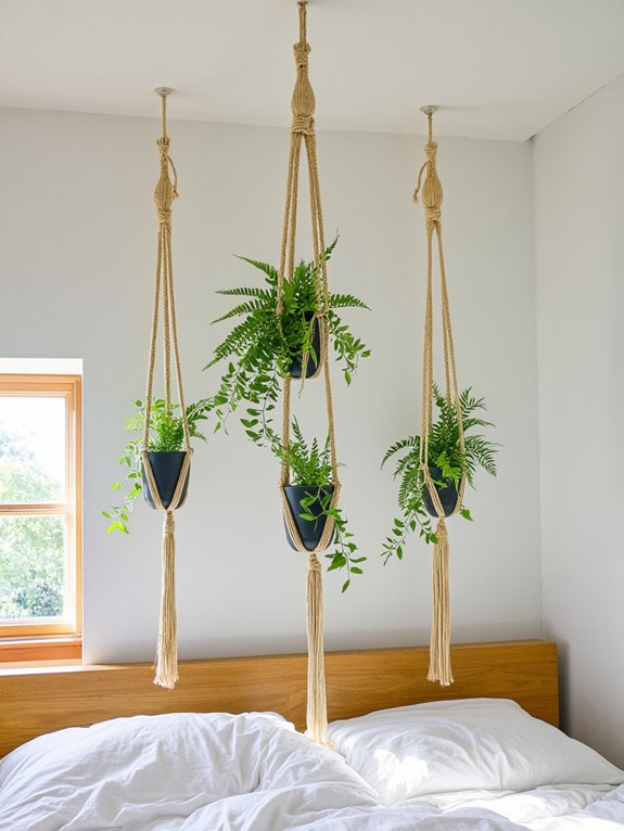 Modern hanging macrame plant displays combine artistic craftsmanship with indoor gardening, offering a stylish way to maximize vertical space in bedrooms. These suspended plant holders merge natural elements with bohemian design while creating visual depth and improving air quality.