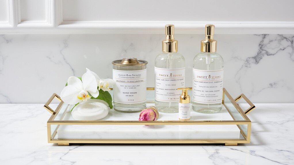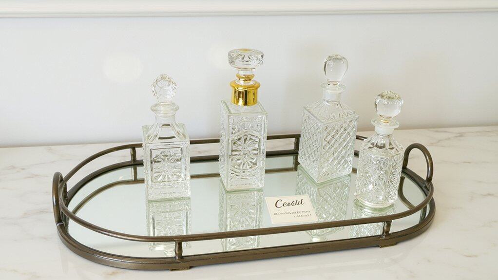 Begin transforming your powder room by setting up a decorative perfume bottle display on your vanity or shelf. Choose a spot that’s 18-24 inches wide to showcase 3-5 bottles. This small touch adds elegance instantly.