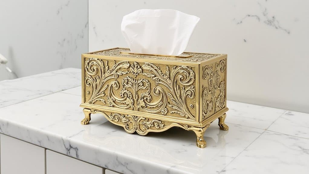 An ornate tissue box cover can instantly refine the look of your powder room with subtle elegance. You’ll love how this small detail transforms a mundane item into a chic accent. Choose one around 5” x 5” x 5.5” to fit standard tissue boxes.