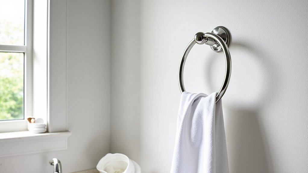 Transform your powder room with a luxurious hand towel ring that adds both function and flair. You’ll love how this small detail elevates your space instantly. Choose a ring that’s 6-8 inches in diameter for ideal towel fit and install it 48 inches above the floor near the sink for easy access.