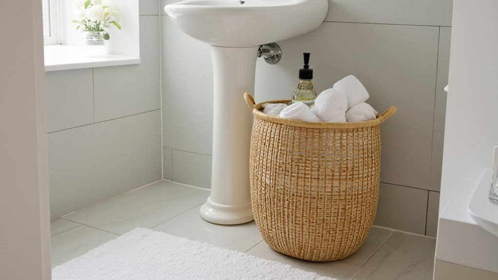 Think of your powder room as a tiny canvas begging for smart storage solutions. A sleek storage basket can transform clutter into chic organization. Place a woven basket, about 12 inches wide and 10 inches tall, under the sink for a quick fix.