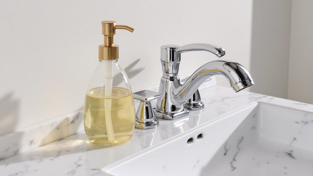 Moving from the striking impact of an elegant mirror frame, consider elevating your powder room with a stylish soap dispenser. It’s a small detail, but it transforms the sink area. Pick one that matches your decor—think sleek glass or modern metal.