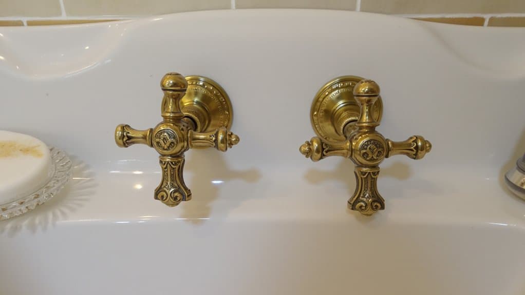 While you’re enhancing your powder room’s charm, don’t overlook the impact of vintage-inspired faucet handles for a timeless look. These small details can transform your sink area into a classic focal point. Swap out modern handles for designs mimicking 1920s brass or porcelain styles, sized around 2-3 inches wide.