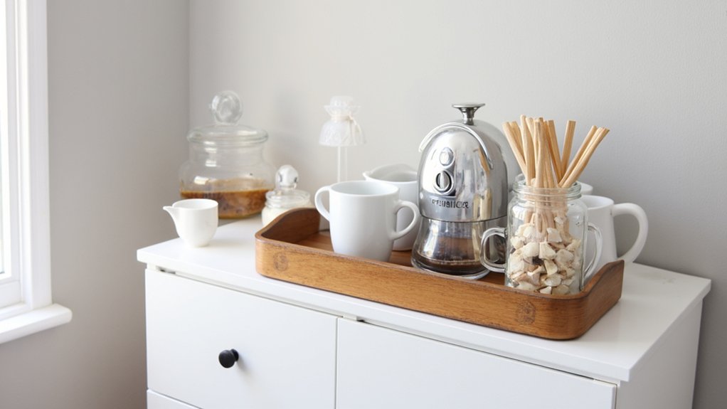 Crafting a mini coffee station in your guest bedroom adds a thoughtful touch for overnight visitors. Set it up on a small 12”x18” tray on a dresser for easy access. You’ll create a cozy nook that’s both practical and chic.