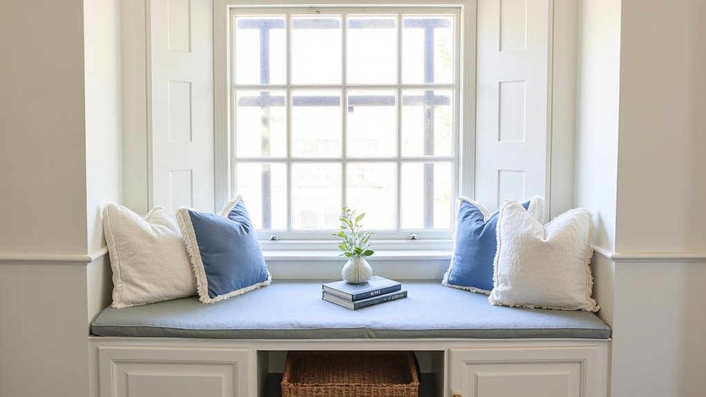 As you set up your guest bedroom, consider crafting a cozy window seating nook to elevate comfort. This spot can be a quiet retreat for guests. Start by measuring your window area—aim for a 48-inch-wide bench to fit snugly.