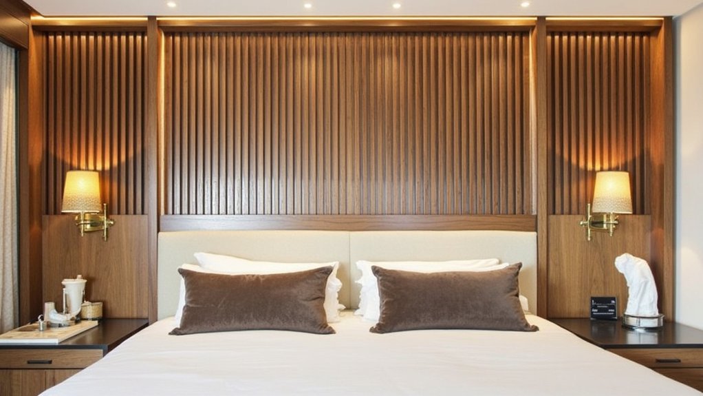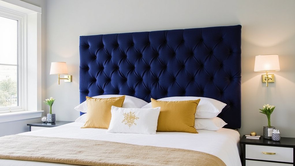 Let’s shift focus to adding a touch of luxury with a plush velvet headboard in your guest bedroom. Imagine transforming your space with a soft, elegant centerpiece. Choose a headboard around 60 inches wide for a queen bed, ensuring it stands 48-54 inches tall for impact. Install it within a day using basic tools.