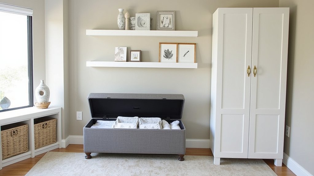 Creativity shines when you tackle stylish storage solutions for your guest bedroom, making the space both functional and inviting. You’ve gotta maximize every inch—think multi-purpose furniture like ottomans with hidden compartments or under-bed storage bins (at least 30 inches long for larger items).