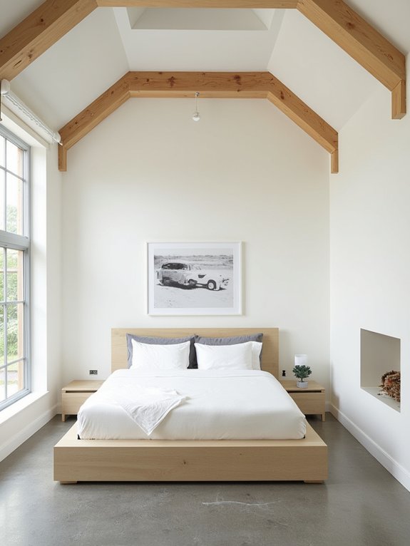 Exposed ceiling beams create striking architectural features in minimalist bedroom designs, adding rustic warmth and vertical dimension while maintaining clean aesthetics. The natural wooden elements draw the eye upward and establish a compelling focal point without cluttering the space.