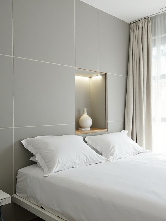 The niche typically measures 24 inches wide by 18 inches deep and can include built-in LED lighting and floating shelves for displaying decor. The smooth concrete finish adds industrial appeal while serving as a sophisticated alternative to traditional storage furniture like nightstands, particularly when positioned near the bed.