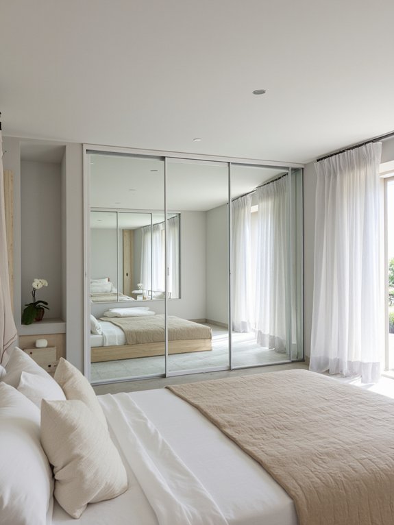 Mirrored sliding wardrobe doors offer dual functionality in minimalist bedrooms by maximizing space efficiency and enhancing natural light distribution. These doors create an illusion of expanded space while providing full-length mirrors for daily dressing needs.