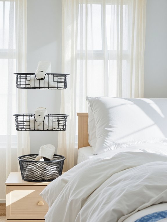 Metal storage baskets offer a sleek, minimalist solution for bedroom organization while adding contemporary style. With options like wire mesh and perforated designs in matte black or brushed nickel finishes, these durable containers provide versatile storage possibilities from under-bed to wall-mounted arrangements.