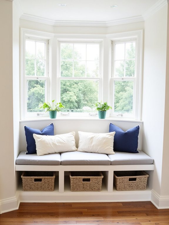 A custom storage bench beneath your window creates three essential benefits: additional seating, hidden storage space, and an enhanced room aesthetic. Built-in benches maximize the use of often-underutilized window areas while providing a practical storage solution.