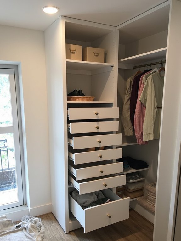 Pull-out drawer room dividers serve as smart space solutions that combine storage with room separation. These floor-to-ceiling units feature integrated drawers that help organize belongings while creating distinct zones within a space.