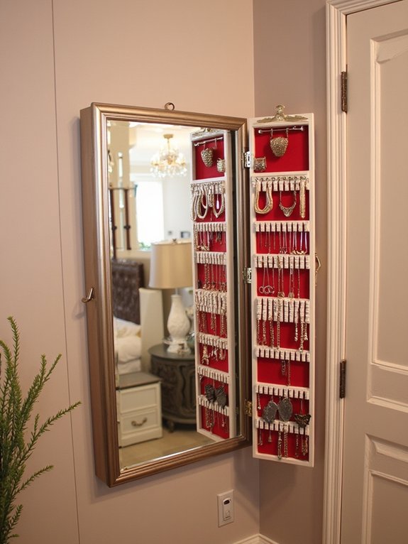 A wall-mounted jewelry mirror cabinet provides discreet storage while maintaining functionality as a full-length mirror. When opened, the cabinet reveals an organized system of hooks, shelves, and compartments specifically designed to store and display jewelry collections.