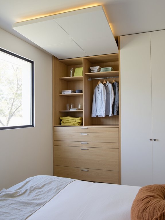 Hidden ceiling storage drawers offer a creative solution for maximizing bedroom storage without consuming floor space. By installing sliding drawers 12-18 inches below the ceiling using heavy-duty brackets, homeowners can create additional storage areas that remain virtually invisible when closed by matching the ceiling color.