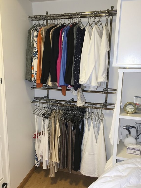 A vertical closet rod organizer maximizes hanging space by utilizing the full height of your storage area, allowing you to double or triple your available room. By installing cascading hooks or adding a second tension rod below the main one, you can create multiple hanging levels for clothes.