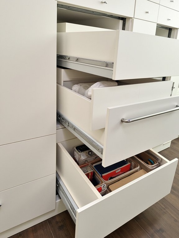 These drawers, equipped with soft-close mechanisms for smooth operation, can add up to 40 square feet of storage space in a typical bedroom. The system requires proper installation with brackets rated for substantial weight capacity, ensuring both functionality and safety while maintaining a clean, uncluttered appearance.