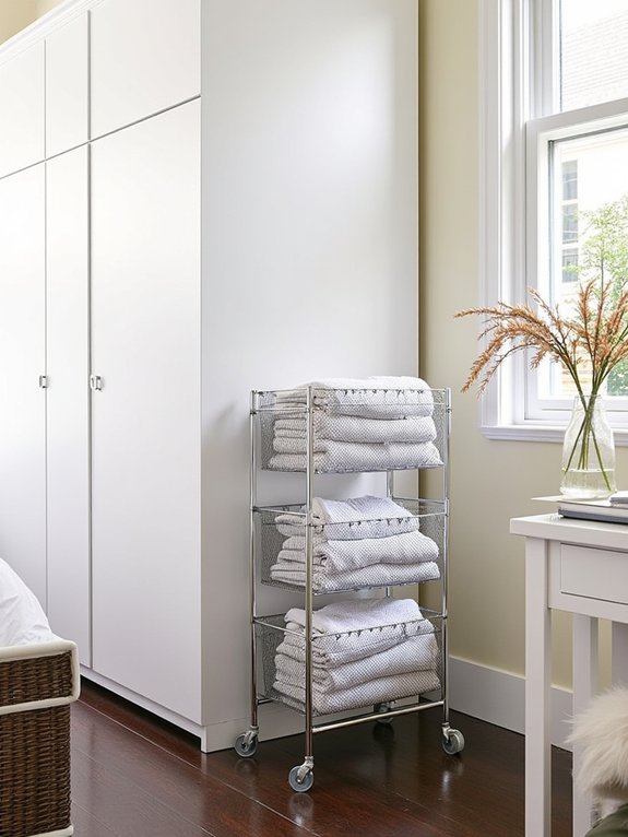 A folding laundry storage cart combines organization and space-saving design to maximize bedroom functionality. With multiple tiers for sorting different clothing types and built-in hanging rods, these mobile units help maintain a clutter-free environment while providing easy access to laundry essentials.