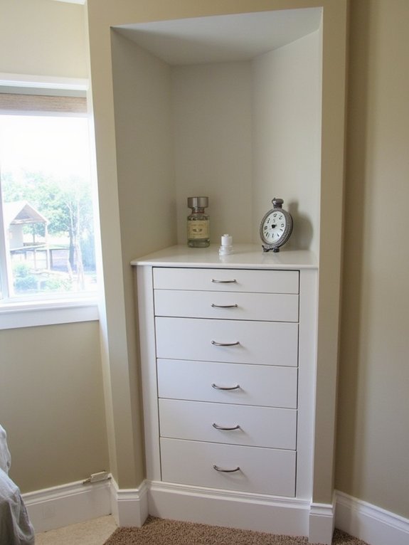 The design can be customized with practical features like full-extension drawers, integrated lighting, and adjustable shelving to maximize storage efficiency. Whether incorporated into an alcove or built between wall studs, these units provide organized storage for clothing and accessories while maintaining a clean, uncluttered look that doesn’t intrude into the living space.