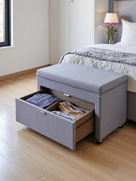 The bench can be designed with hinged compartments measuring 18-24 inches deep or pull-out drawers to store seasonal items, bedding, or books. Adding decorative cushions and pillows transforms the space into a cozy reading nook while maintaining functionality. The design seamlessly integrates with your room’s natural light and visual flow while offering valuable concealed storage.