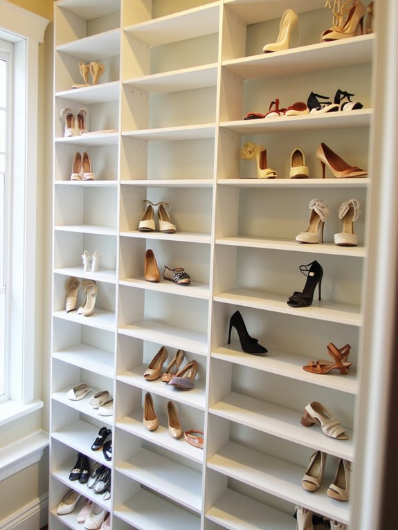 Built-in closet shoe cubbies transform unused vertical space into organized storage compartments, offering a practical solution for keeping footwear neatly arranged and accessible. The customizable design allows for varying compartment sizes to accommodate different types of shoes while maximizing the use of available closet space.