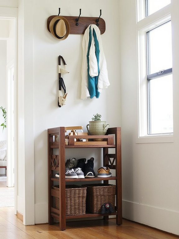 For optimal functionality, select a bench 18-24 inches high with slatted shelves to prevent dirt buildup. Position the unit against a wall, maintaining 36 inches of walking space in front. Adding storage hooks above the bench creates additional organization options for coats, bags, and accessories.