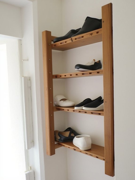 A folding hallway shoe shelf offers adaptable storage that can be expanded or collapsed on demand. When not needed, it mounts flat against the wall, protruding only 4 inches, but can extend up to 24 inches horizontally for additional shoe storage.