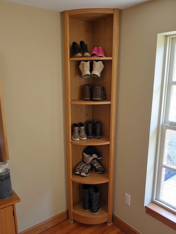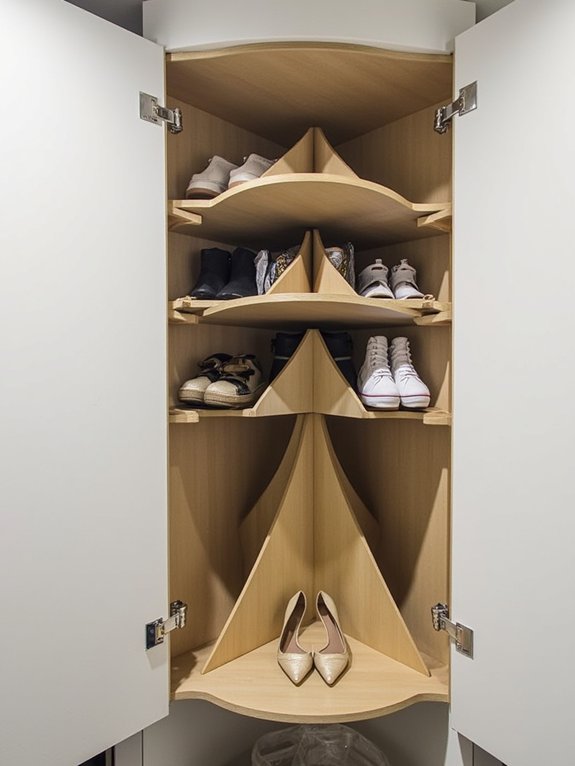 The stackable corner storage unit maximizes shoe storage in underutilized corner spaces. These modular units can be stacked up to 6 feet high while maintaining stability, with each tier accommodating 3-4 pairs of shoes and offering easy access.