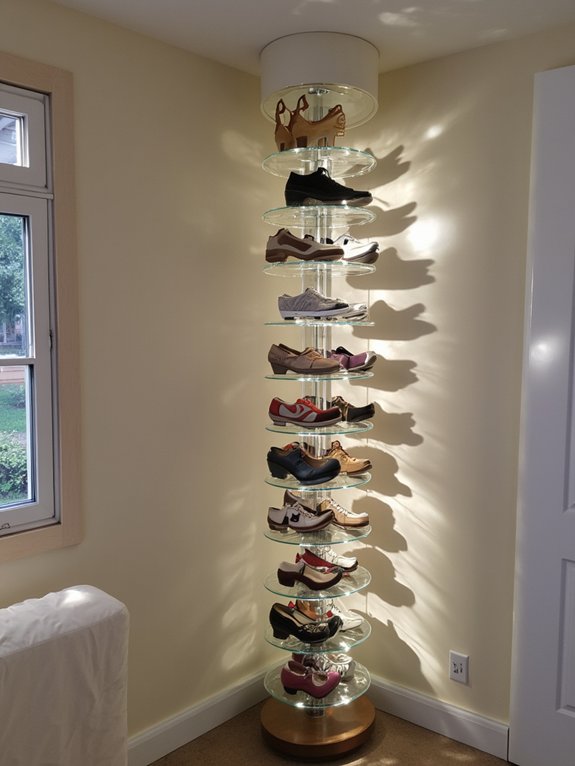 A rotating vertical shoe tower maximizes storage in minimal floor space, holding up to 30 pairs of shoes in just two square feet. The unit spins smoothly, providing quick access to footwear while protecting them from dust behind clear panels. Adjustable shelves accommodate different shoe heights and styles.