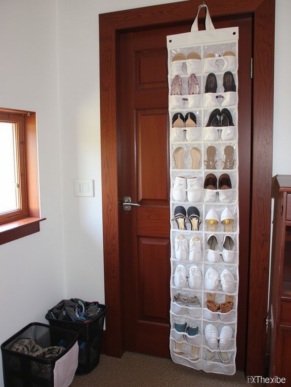 An over-door hanging shoe organizer provides efficient storage for up to 24 pairs of shoes without taking up valuable floor space. The unit hangs securely on any standard door using reinforced metal hooks and adjustable straps, making it ideal for closets, laundry rooms, or entryways.