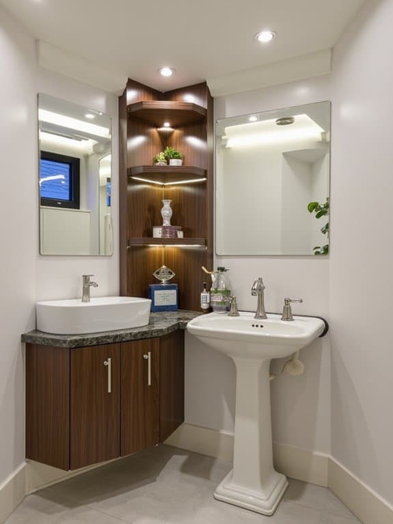 Strategic placement of corner fixtures maximizes every inch while maintaining a clean aesthetic. Options include mirrored medicine cabinets that serve dual purposes, tiered shower caddies for vertical storage, and custom corner vanities with built-in compartments. Staggered floating shelves or glass units supported by corner brackets provide additional storage while adding visual interest to the space.